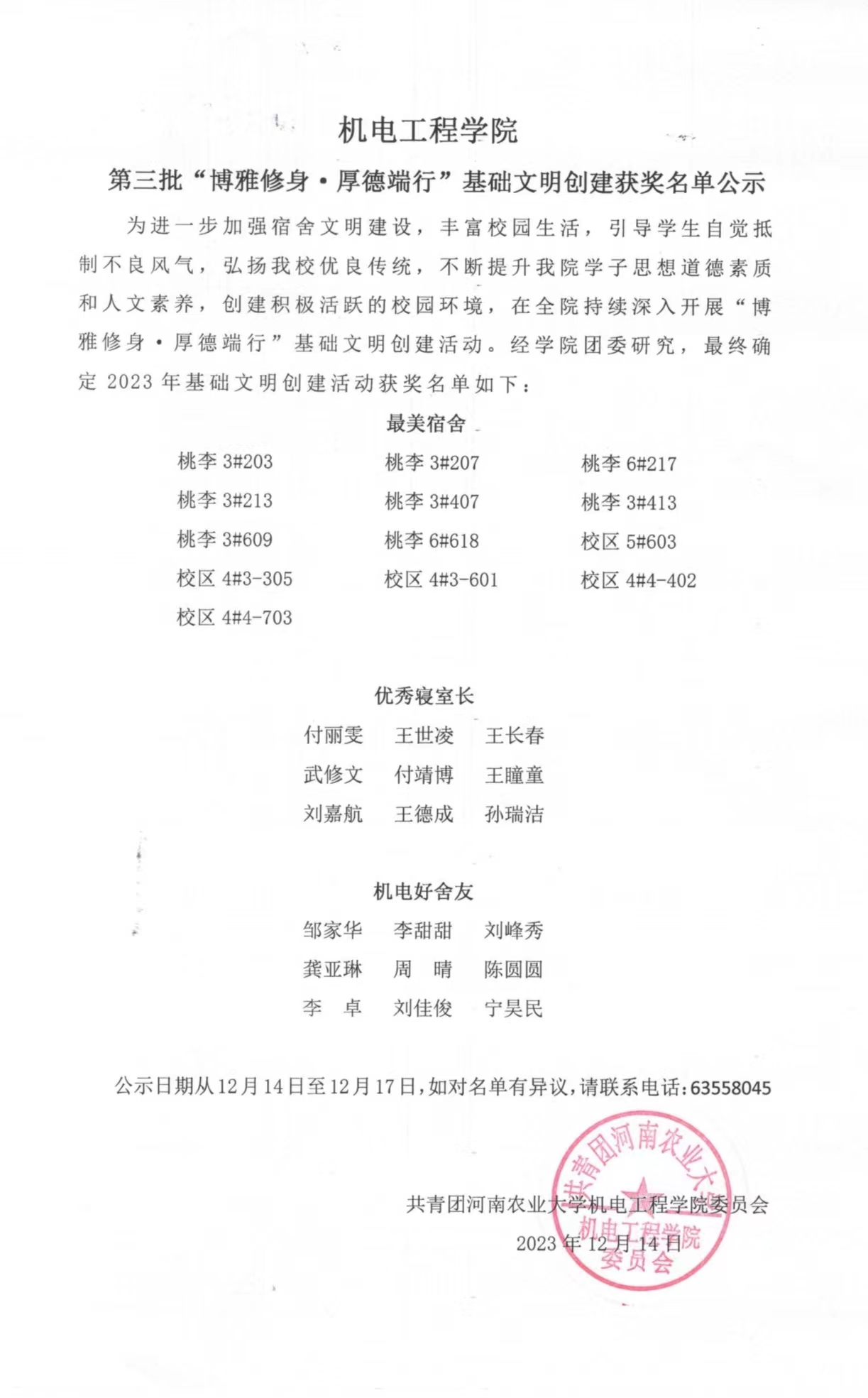 为进一步加强宿舍文明建设,丰富校园生活,引导学生自觉抵制不良风气,弘扬我校优良传统,不断提升成人影院 学子思想道德素质和人文素养,创建积极活跃的校园环境,在全院持续深入开展“博雅修身·厚德端行”基础文明创建活动。经学院团委研究,最终确定2023年基础文明创建活动获奖名名单如下: