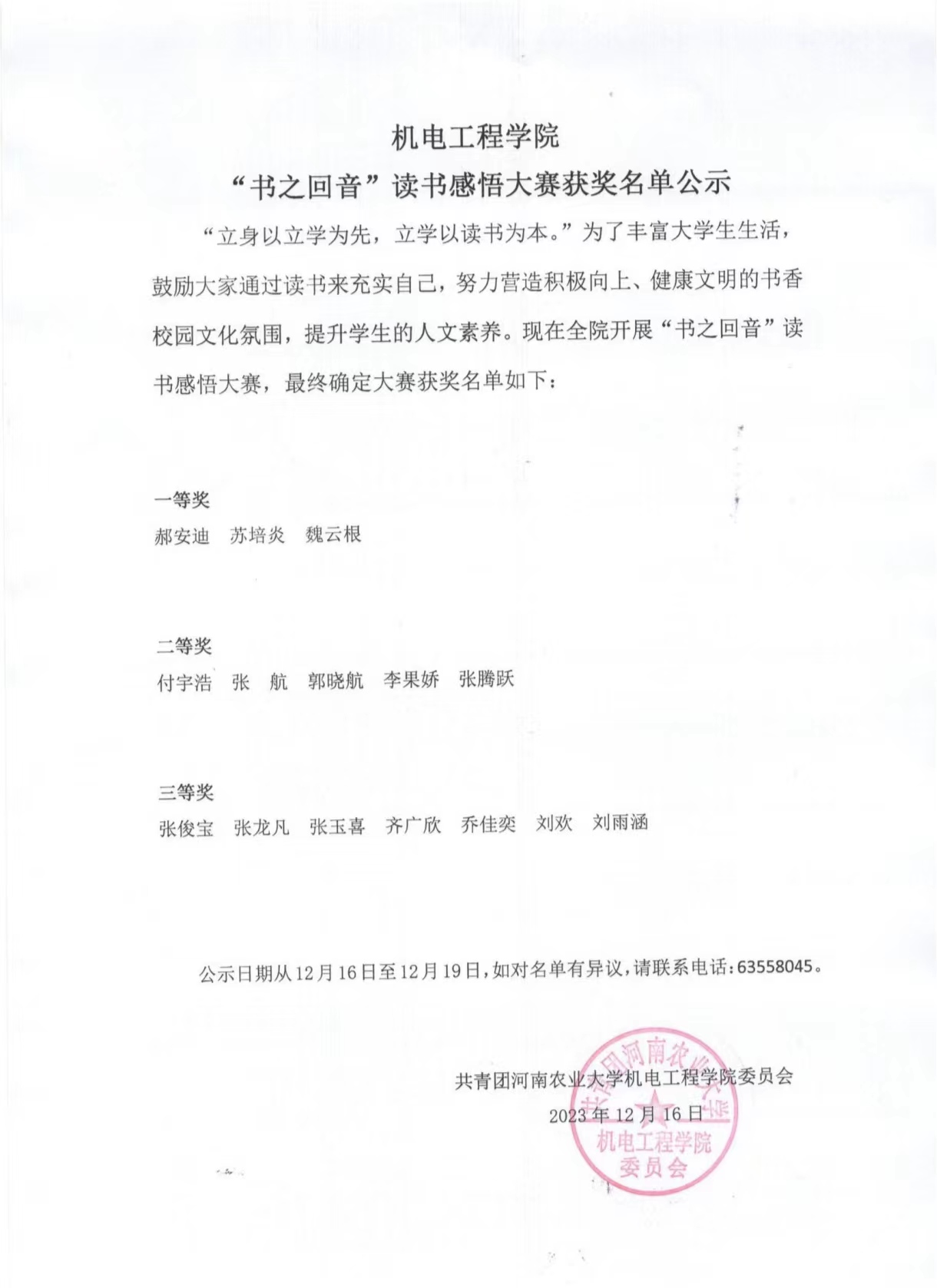 “立身以立学为先,立学以读书为本。”为了丰富大学生生活,鼓励大家通过读书来充实自己,努力营造积极向上、健康文明的书香校园文化氛围,提升学生的人文素养。现在全院开展“书之回音”读书感悟大赛,最终确定大赛获奖名单如下: