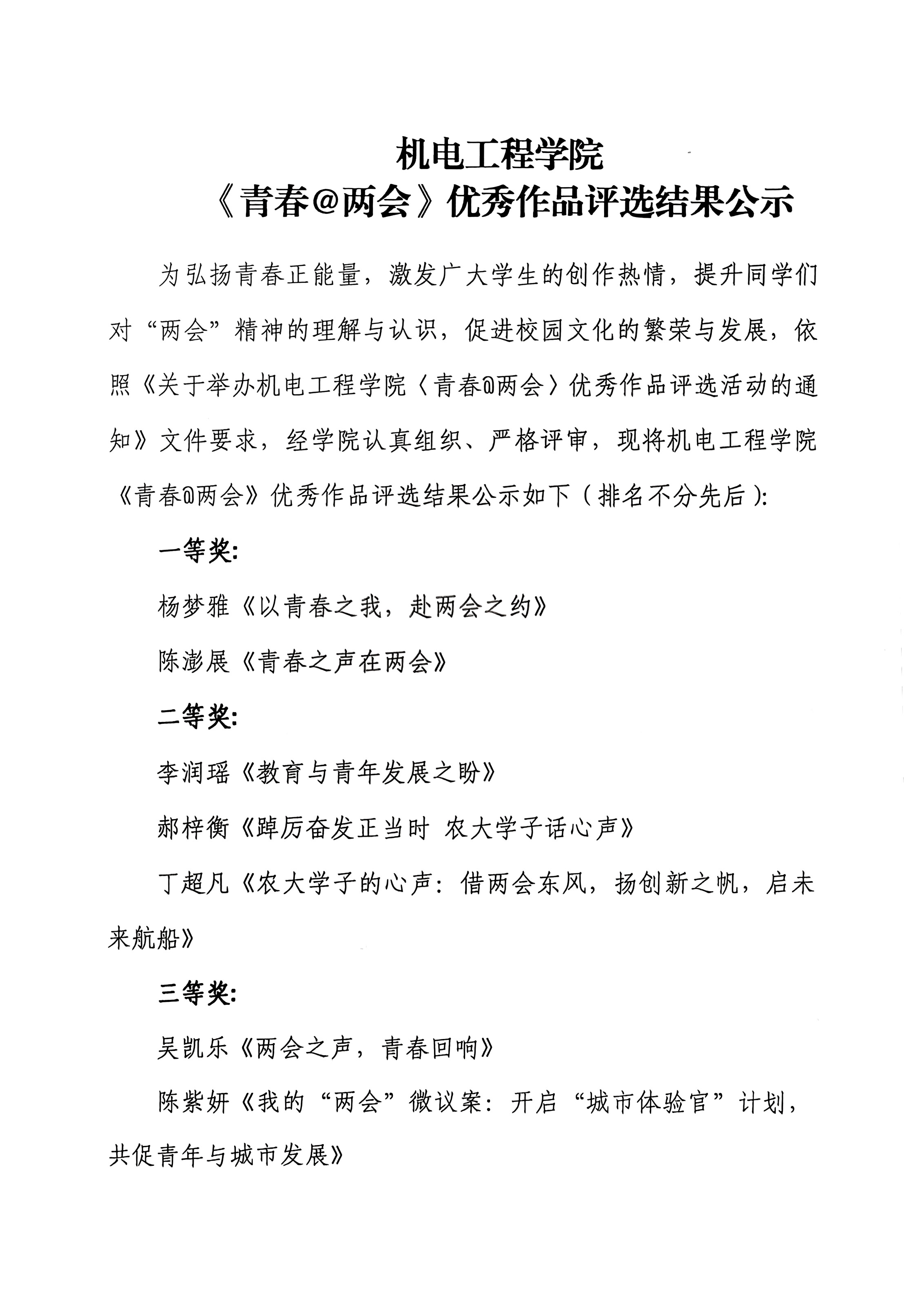 为弘扬青春正能量,激发广大学生的创作热情,提升同学们对“两会”精神的理解与认识,促进校园文化的繁荣与发展,依照《关于举办成人影院 <青春@两会>优秀作品评选活动的通知》文件要求,经学院认真组织、严格评审,现将成人影院 《青春@两会》优秀作品评选结果公示如下(排名不分先后):
