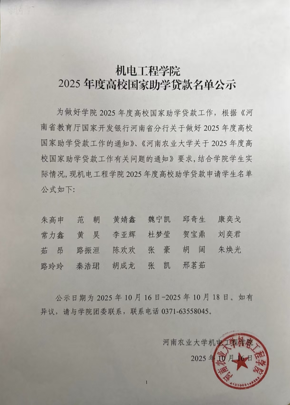 为做好学院2025年度高校国家助学贷款工作,根据《河南省教育厅国家开发银行河南省分行关于做好2025年度高校国家助学贷款工作的通知》、《成人影院 关于2025年度高校国家助学贷款工作有关问题的通知》要求,结合学院学生实际情况,现成人影院 2025年度高校助学贷款申请学生名单公式如下: