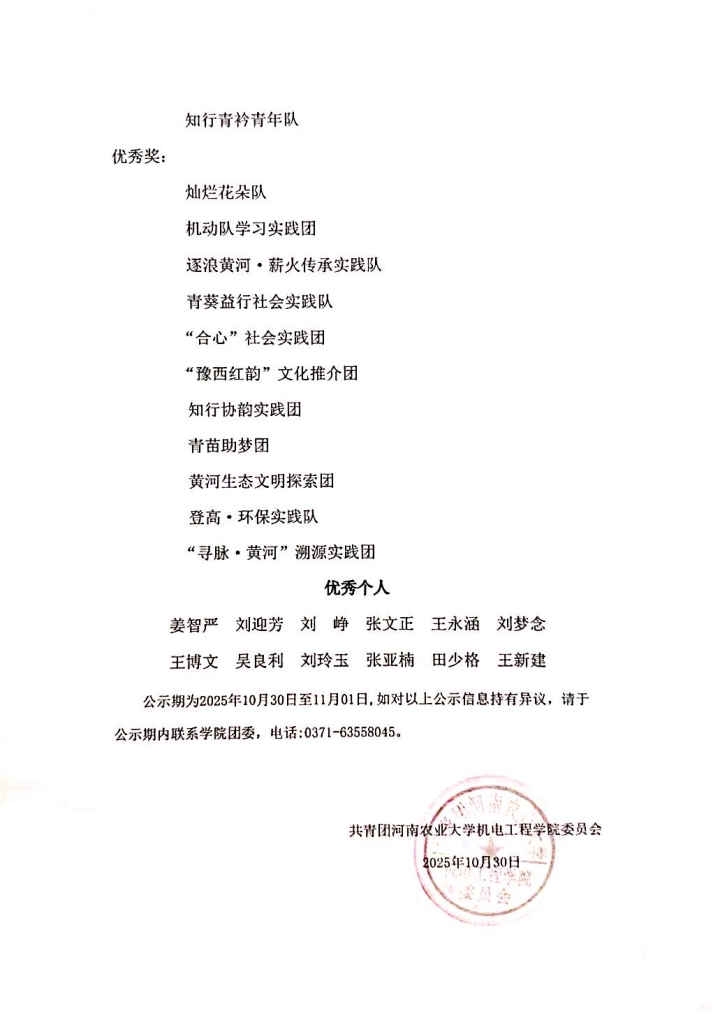 根据共青团成人影院 委员会《关于开展2025年成人影院 暑期“三下乡”社会实践活动的通知》文件要求,为表彰先进、树立典型,增强广大同学奉献热情、弘扬志愿精神,通过实践团队申报、资料审核、学院决赛等环节,现将成人影院 2025年暑期“三下乡”社会实践优秀团队和优秀个人予以公示(排名不分先后):