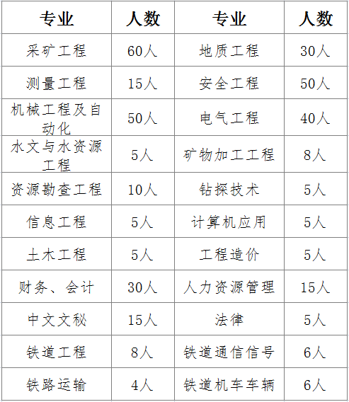 专业技能人才110人。招聘要求:1.煤炭开采、通风与安全及机电等煤炭相关主体专业毕业,全日制大专及以上学历;2.身体健康,具备良好的职业道德及团队合作精神,操作能力强;3.认同公司成人影院,愿意与企业共同成长;4.具有生产矿井一线工作经验者优先录用。